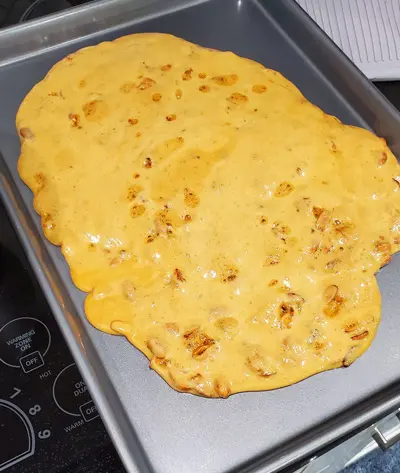 The next tip I have regarding this cookie sheet - just before you turn on the stovetop - preheat your oven to a low temp (i.e. 200 degrees F). When the gooey brittle is ***almost done (like 275 degrees-ish, I like to put this cookie sheet in the warmed oven for 2-5 minutes. That way, it allows the gooey mix to spread out better on a warm pan.